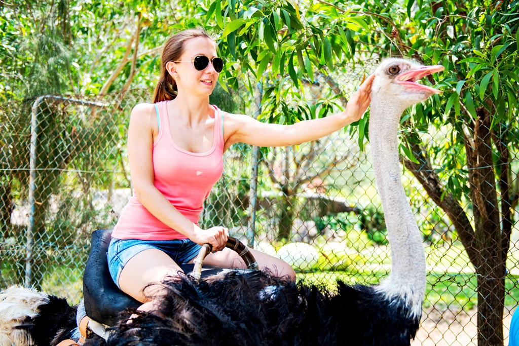 Ngồi trên lưng bạn đà điểu chân dài thật không hề đơn giản như ngồi trên lưng ngựa. Vì thế đến Đảo Khỉ, nhất định phải thử cảm giác lắc lư trên lưng loài chim khổng lồ này nhé.