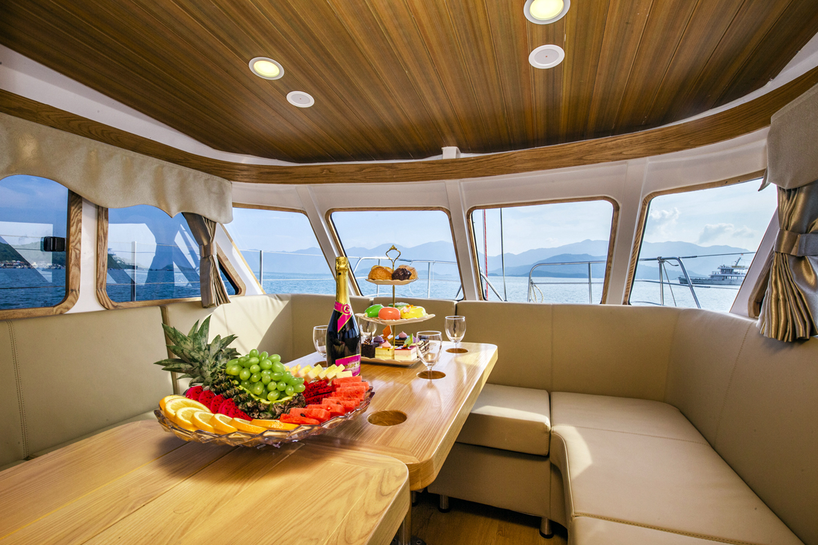 - Các tiện nghi sang trọng trên Du thuyền Buồm Catamaran: Wifi, Điều hoà, Âm thanh, Karaoke, Buồng tắm nước ngọt…