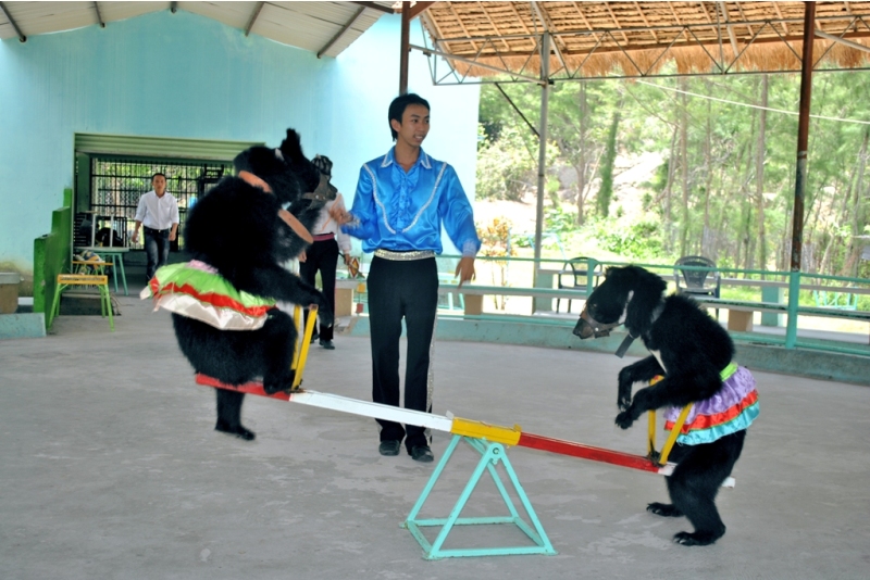Gấu ở suối hoa lan được huấn luyện rất kỹ nên làm được nhiều việc mà chúng ta không thể ngờ như đi thăng bằng, bập bênh, gấu đạp xe, đi xe máy và cũng chính tiếc mục này làm người xem không thể nghi ngờ vì các động tác được thực hiện một cách không thể tin được, làm sao một chú gấu có thân hình bệ vệ, bốn chân đầy móng vuốt nhưng lại điều khiển được một chiếc xe máy lượn qua lượn lại và cuối cùng gấu ta nhận được phần thưởng là đồ ăn từ người huấn luyện và những tràng vỗ tay tán thưởng của du khách.